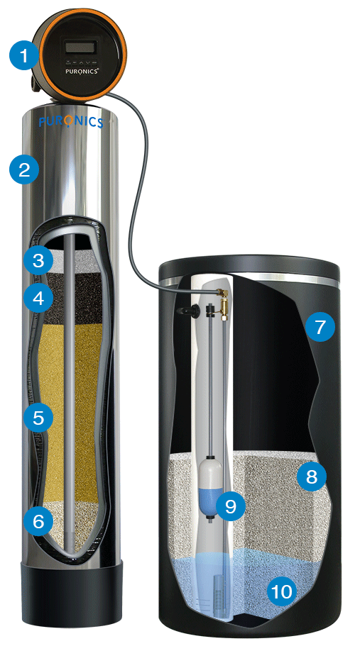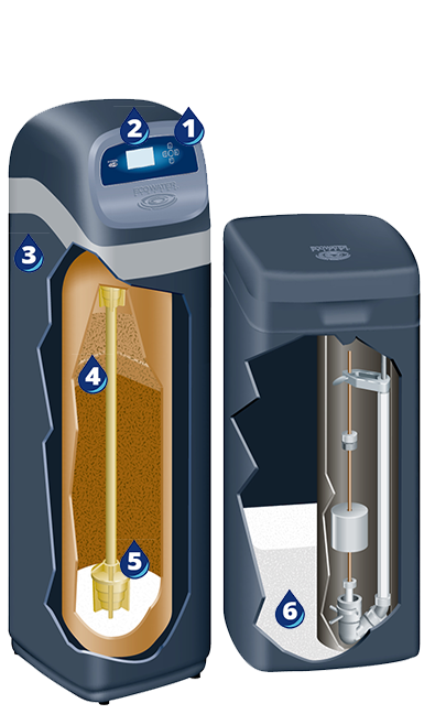وهو عبارة عن منظومة تعمل باستخدام نظام التبادل الايونى (الريزين) لإزالة الايونات الموجبة (الكالسيوم – الماغنيسيوم) من خلال مادة حبيبية مشحونة بأيونات الصوديوم وعند وصولها لحالة التشبع تحتاج إلى إعادة تنشيط من خلال ملح الصوديوم المتوفر فى تانك المحلول.